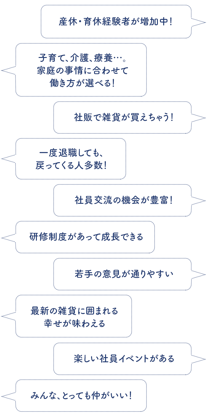 可愛いものが大好きで、アイデアを形にするのが好きな人、大歓迎! 働く仲間の意見を取り入れながら、働きやすさが日々進化しています。